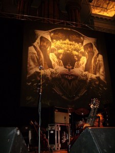 The Lad was the one to notice that the huge backdrop version of the album cover looked curiously like a lion or big cat face at this size – surely not an accident, the cover is indeed odd being a mirror reflection of a few of the band dressed up in monkish gowns.