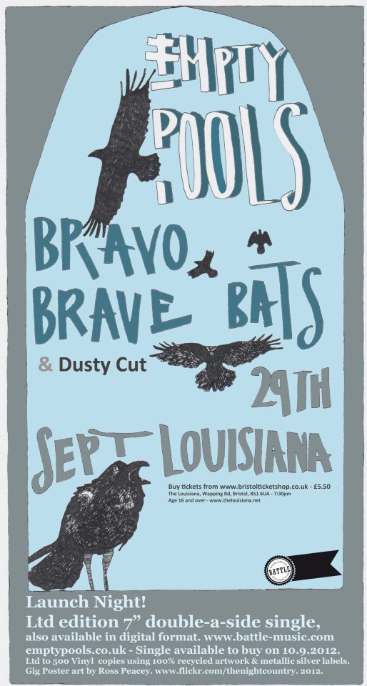 I first saw Ross’ work in the poster for the forthcoming Empty Pools and Bravo Brave Bats gig (which I would encourage anyone who can to roll along to the Louie on 29th September).