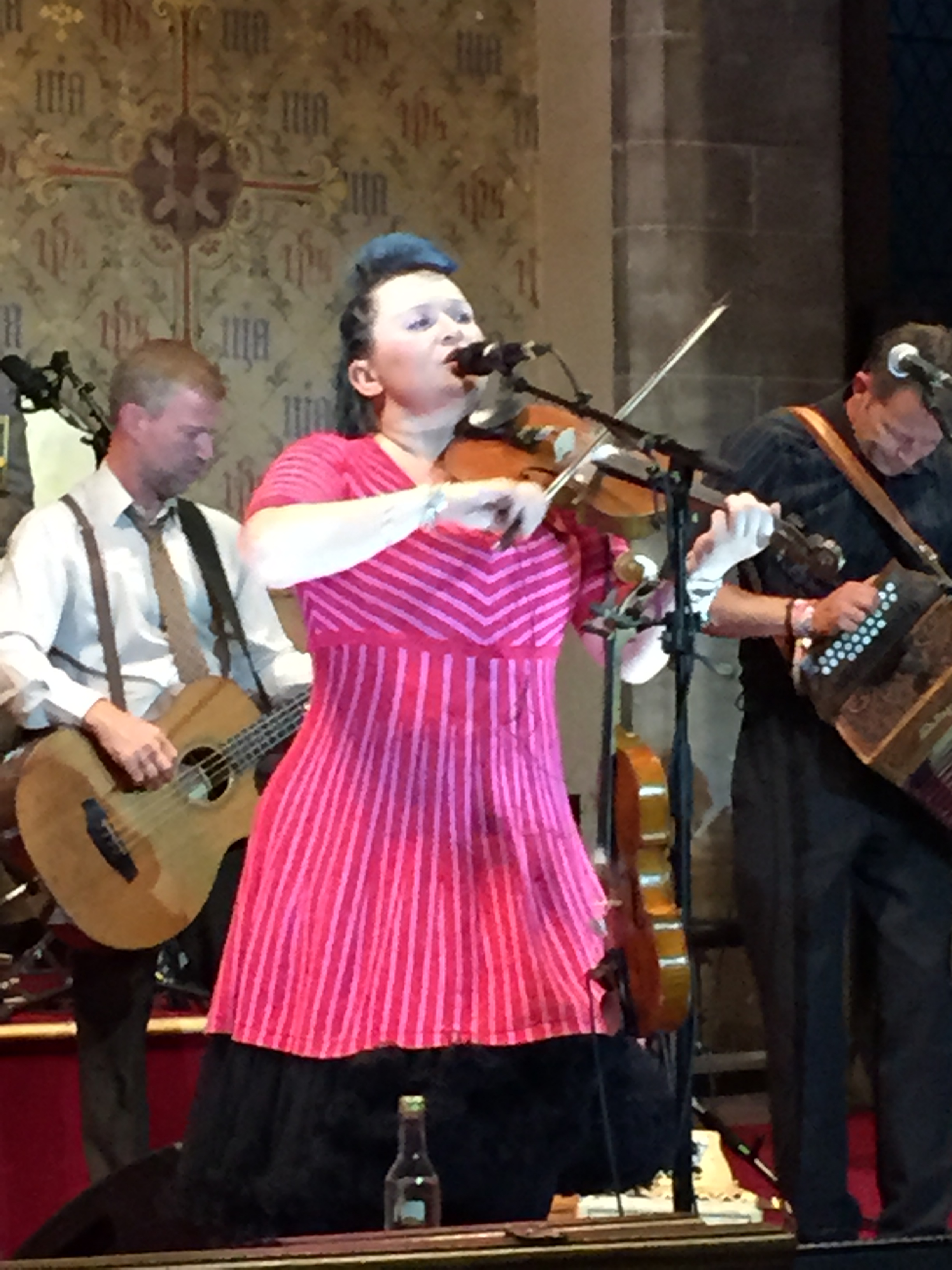 Eliza Carthy is of course of royal English folk lineage (you would have to be with parents like Martin Carthy and Norma Waterson) but she has always been her own person and done it her own way, which is nothing if not admirable. Full of throat, fine of voice and ferocious of fiddle, she leads a remarkable twelve piece band (fiddles, guitars, drums, percussion, melodeons, trombone etc) whose sound is appropriately huge, impassioned and joyous.